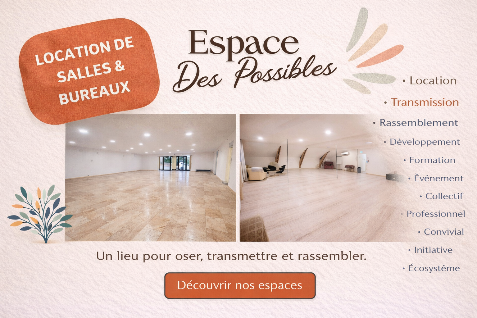 L’Espace des Possibles est avant tout un lieu de location de salles et de bureaux modulables, pensé pour accueillir projets, événements et initiatives variées.